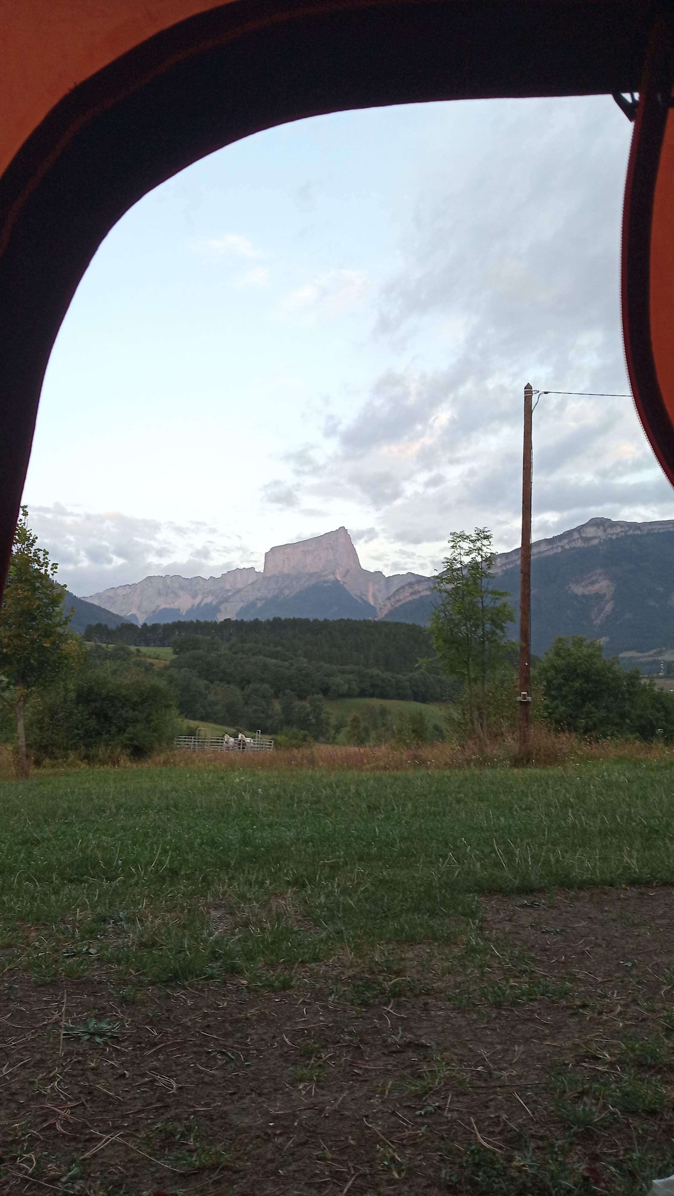 Super Camping avec une vue aussi magnifique sur le Mont Aiguille at la chaine du Vercors côté est. Des gens magnifiques qui gers le camping. Simple, calme et un bon prix, avec, rarement, une cuisine toute équipée avec frigo, avec salle à manger en cas d'orages. Il faut s'habituer aux coqs le matin, mais après quelques jours ce n'était pas un problème!