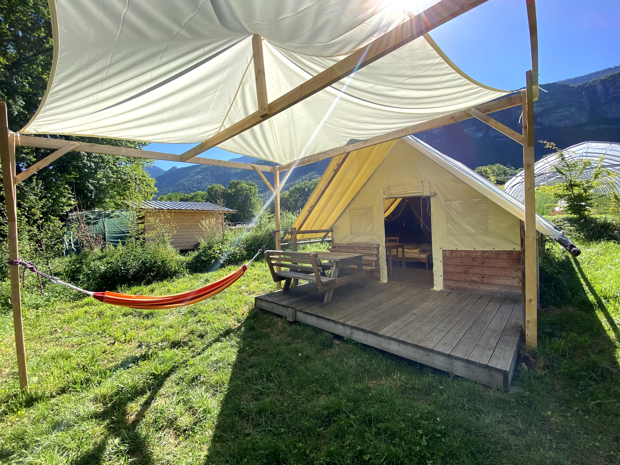 Petit havre de paix au pied du Taillefer (paroi rocheuse), et à quelques mètres de la plage sud du Lac d'Annecy (Doussard). Nous avons séjourné dans une large cabane canadienne en bois, bien protégée des toiles épaisses. Lit confortable, coin cuisine et repas, frigo, électricité, terrasse et hamac, c'était le paradis au milieu même des jardins et des serres de nos hôtes. On recommande vivement cette expérience style camping en pleine nature, pour la tranquillité des lieux, la gentillesses des hôtes, leur restaurant végétarien délicieux et la proximité du lac et de ses activités.